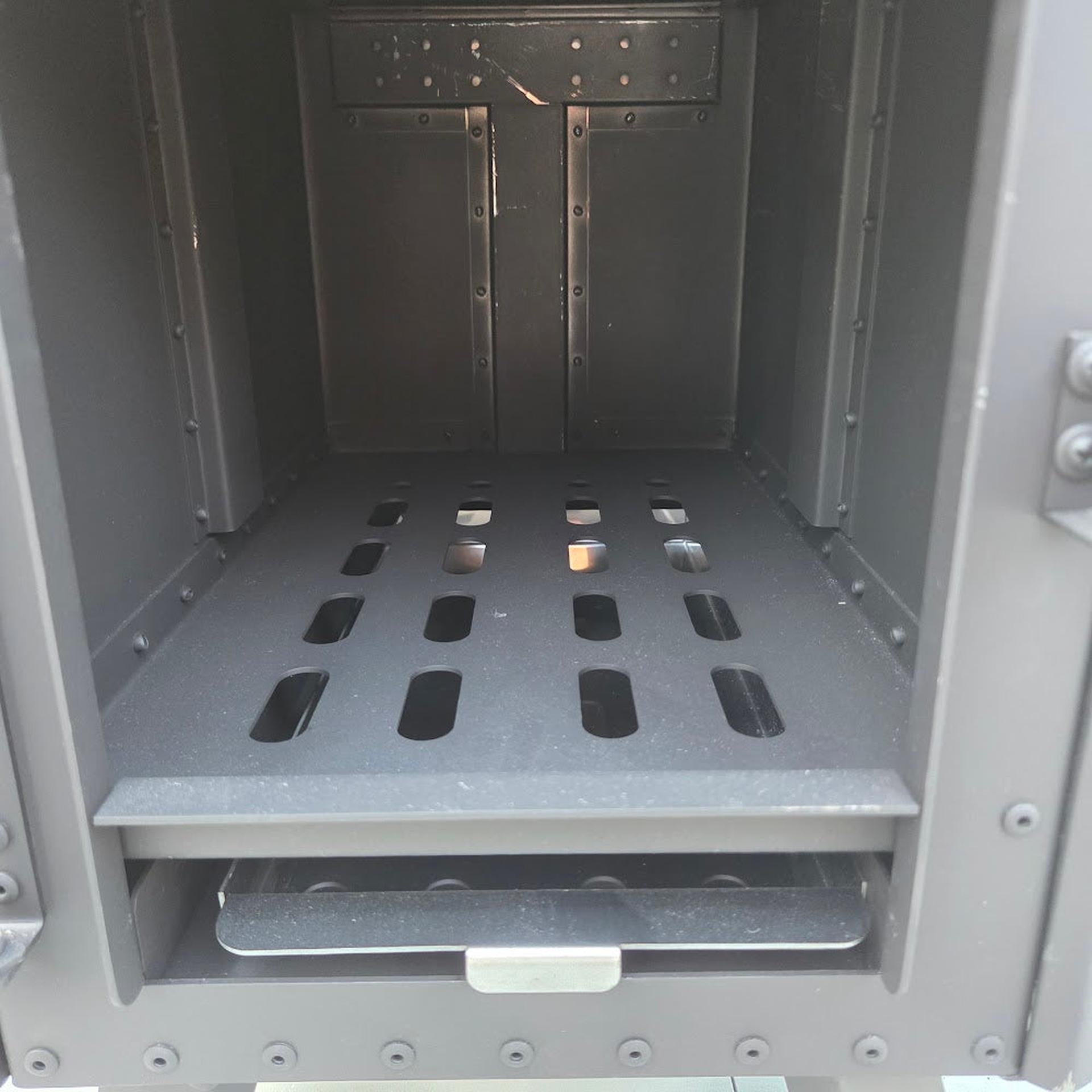 Et metallbrett skal monteres inne i ovnen på undersiden av pipehullet. Det gjøres enklest ved å føre brettet inn på skrå i overkant av festene i ovnsveggen.